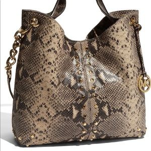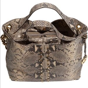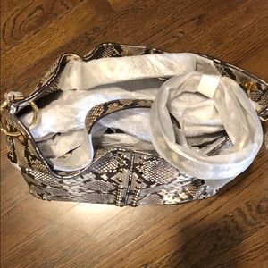 This is a stunner! Perfect with neutrals or black. Has gold hardware and shoulder strap. Snakeskin print. A perfect neutral.