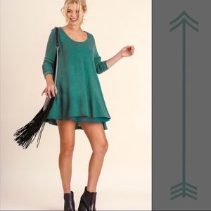 Umgee Layered Trapeze Swing Mini Dress or Tunic In Heather Grey. Sheer chiffon layer under the front only. Long sleeves. Scoop neck. **Last pics are to show fit only!! Hunter Green version is also available in my closet.