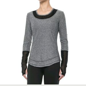 Mesh sleeves begin just below elbows and end halfway down the hand, with thumb holes. Mesh detail also at collar, going all the way around. Curved hem that dips down a little at the front and back, with some nice stitching detail. Great neutral tone