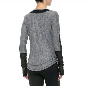 Such a cool and unique active top! Moisture-wicking fabric. Has a vertical line of reflective dots at the top of the back.
