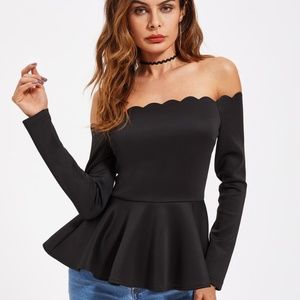 Black Off Shoulder Scallop Frill Hem Top. This elegant top is perfect for a night party. The fabric is 95 % Polyester and 5% spandex.