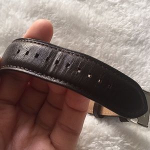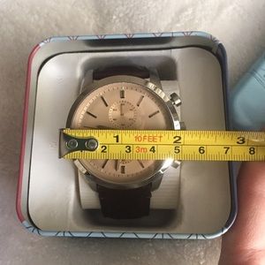Only worn to try on, still new with box! This “Townsman” quartz chronograph watch features a rich chocolate colored genuine leather band with large 48mm champagne-gold face and silver trim. Good battery. Water resistant to 5 ATM. Still has protective plastic on back cover. Some slight wrinkles on band from adjusting on wrist.