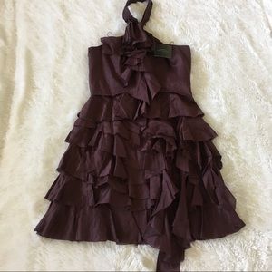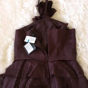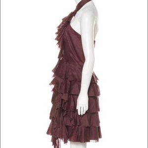 Beautiful layered ruffle halter dress from Robert Rodriguez. The edges are deliberately frayed. The dress is 100% ramie. The lining is acetate. The tag calls the color plum. Snap closure on the nape and concealed zip closure in back. Very fun and different dress. (The pictures of the actual dress reflect its true color.) Brand new with tag.