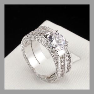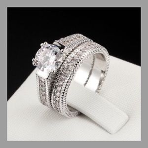 🆕Listing! Beautiful CZ ring set. CZ is rated AAA for quality. 18K white platinum plated. CZ in a prong setting with smaller pave cz’s halfway down each side. Matching band has the same style pave cz’s halfway around it as well.