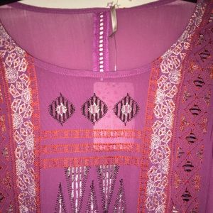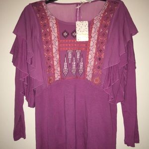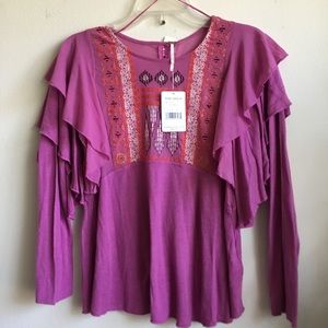 Bright boho detailing on a cool black silhouette. This easy-to-wear cotton top features ruffled sleeves and slightly sheet paneling at front & back