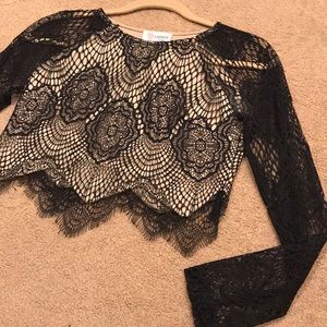 Black lace crop top which features a soft beige underlay, black lace sheer sleeve and black lace trimming at the ends. Beige underlay ends shorter so black lace finishes the top. Fitted style.