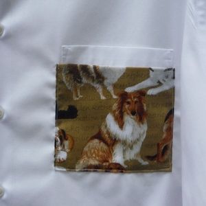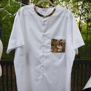 Redesigned, upcycled, short sleeve top with Dogs! darting across the back, on the front pocket, and matching low, banded collar. This is a men's Van Heusen size 18 regular fit, but is approximately the equivalent of a Women's 2X. Makes a great CoverUp or for layering - fabric is light and airy. Nice for summer.
