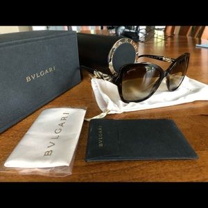 Worn only 1 time. Beautiful and sophisticated looking! Butterfly style sunglasses are decorated with crystals on the side. If you have questions please ask. These glasses are in NEW condition. Originally paid $480. Glasses are a very dark brown color, almost black.. You will feel like a goddess wearing these.
