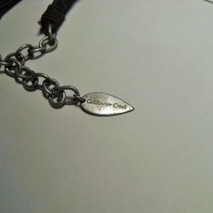 Coldwater Creek Brown pendant necklace, brown silk cord, silver tone, white floral pendant, 20 inches long in very good condition.
