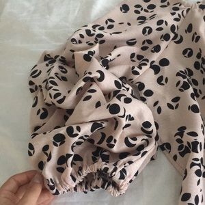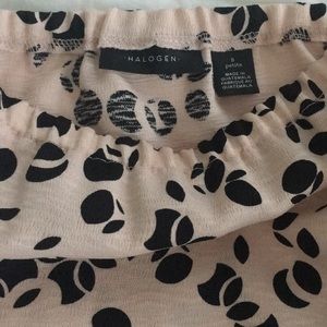NWOT Gorgeous Halogen gathered sleeves off the shoulder top with fragment black dots . Size S Petite but runs like regular small . Never worn .Looks great with pencil skirts tucked in or jeans.