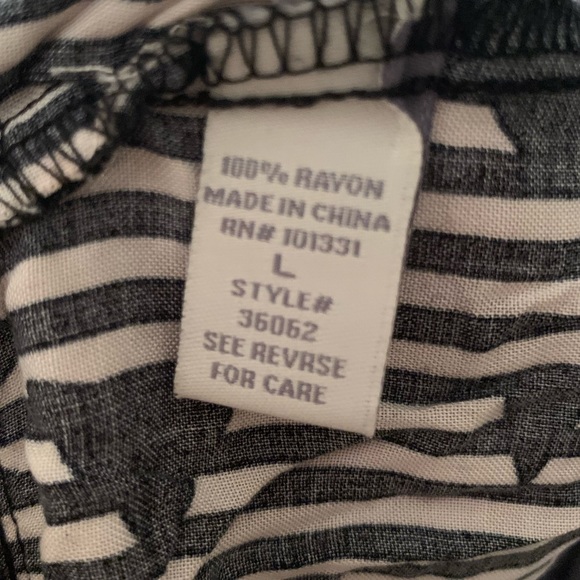 Super cute skirt great for summer. Buttons are functional but with the elastic band in the back this skirt is really a pull on and off type of skirt. In great condition. Runs small. Size says large but is more of a medium. Color is more of a black and Light/faded pink.