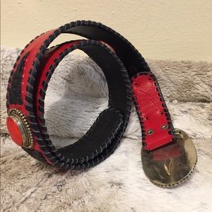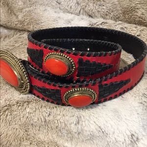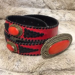 Stunning and unique handmade statement piece in genuine leather embellished with natural stones surrounded by silver tone accents. The buckle is 3 1/4” long and 2” wide The belt strap is 31” long, 1 1/4” wide with 6 holes to adjust the fit. Only worn a few times, it is in excellent used condition.