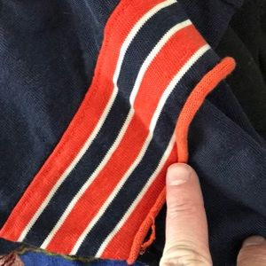 Child’s medium. Well worn but in good shape. One of the orange rings on the arm’s stitching has come partially undone.