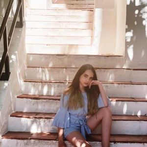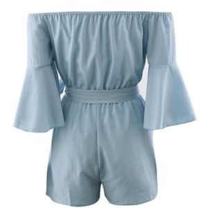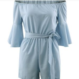 Adorable blue 3/4 sleeve off shoulder romper with tie belt. Made of polyester and has a nice flattering fit!