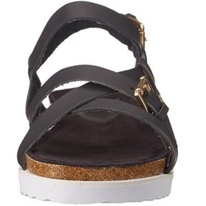 Flatform sandal featuring strappy upper with gold-tone buckles and cork like midsole