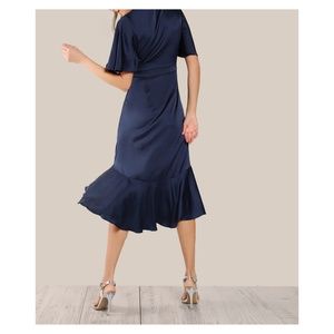 Navy Blue Satin Ruffle Wrap Tie Dress