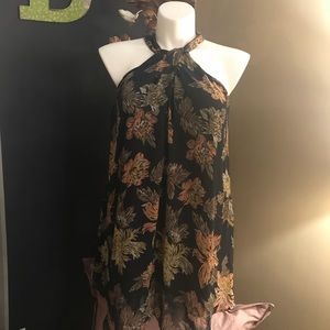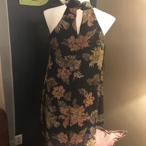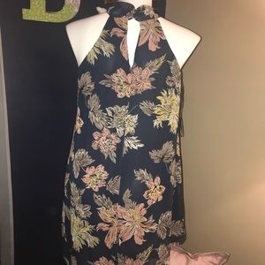 Navy blue ASTR halter dress with flower print. Dress only worn once, great condition! Fastens with two buttons behind neck.