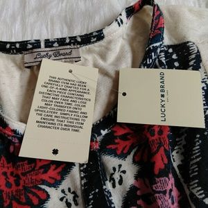 NEW with tags Lucky Brand top. Ivory shade throughout with bight Navy blue, pink and red design on front. Buttons all the way down. Sleeves are cropped with buttons. Fantastic quality, such a great top!