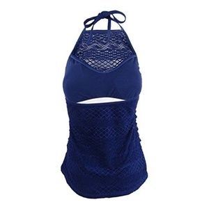 Island Escape Womens Sky High-Neck Crochet Tankini Top Swimsuit Navy Size 12
