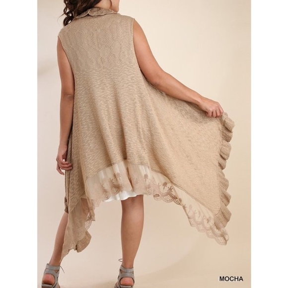 UMGEE Mocha Brown Open Front Ruffled Hi Low Vest Cardigan Tunic Top with scalloped lace hem. Made of soft knit fabric. 65% Cotton 35% Polyester. Brand New in original factory bag.