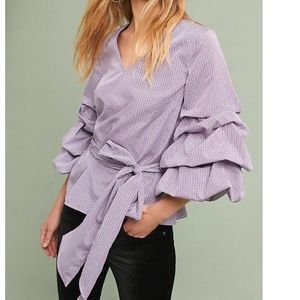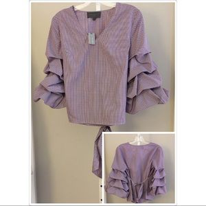 This belted top flatters at the waist and makes a statement with oversized ruffle sleeves.
