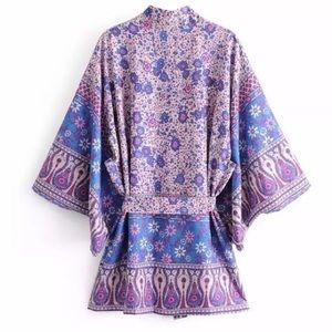 BRAND NEW!! Classic-style kimono with draping sleeves. Beautiful bohemian mixed floral print in bright blues + lilac. Wears perfectly from day to night, + from beach-to-bar.