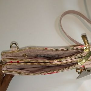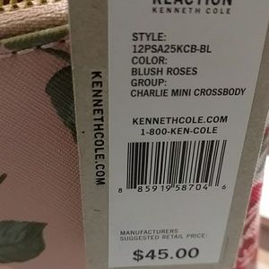 Kenneth Cole Charlie mini floral printed crossbody bag. Color: Blush Roses. Features two top center zips with goldtone zipper pulls. Interior has a zip pocket. Detachable 7"L wrist strap and 49"L crossbody strap. 100% Polyvinyl Chloride. Brand new with tag & never used. From a smoke free home.