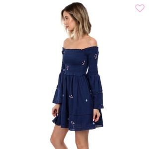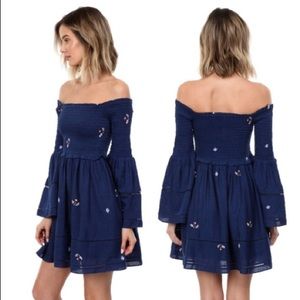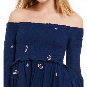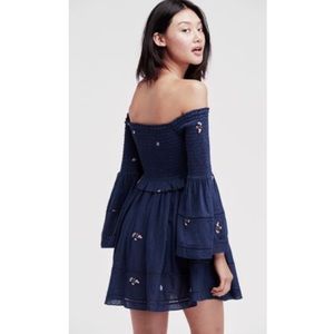 Effortlessly boho in this mini dress from the modern-romantics at Free People. In a fit-and-flare, off-the-shoulder silhouette with a smocked bodice and long bell sleeves. Topped with embroidered daisies all-over and a full mini skirt.