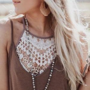 Cute and chic high neck bralette featuring beautiful crochet lace detail and slightly ribbed fabric. Pairs well with low neck tops or on it's own with some cute shorts.