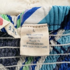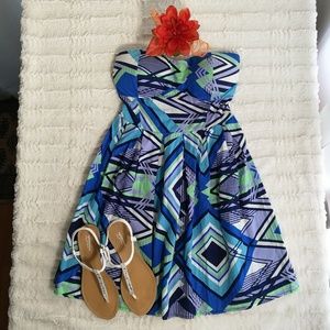 Size juniors large geometric/abstract pattern strapless dress. Fitted sweatheart pleated front & elastic back panel for extra comfort & stretch. Cups are lightly padded, 100% cotton. Measurements are approximate: