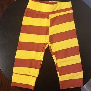 New white onesie with "Snuggle this Muggle" on front. Bottoms and hat are striped maroon and gold. Top: 95% cotton/5% polyester. Bottoms and hat: 100% cotton Sized: 6-12 months