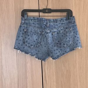 NWOT. Super cute distressed and faded denim cut off shorts with whiskering and an all-over star print. Plain waistband. 5-pocket detailing. Approximately 5" front rise and 13" back rise, and 1-1/2" inseam. Shorts are cut shorter in the front. 100% cotton. Never worn. Perfect for the Fourth of July or everyday!