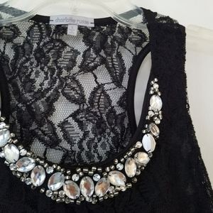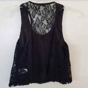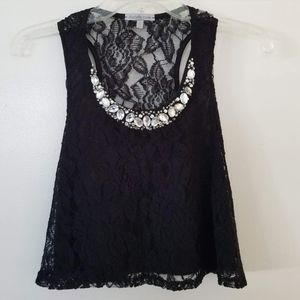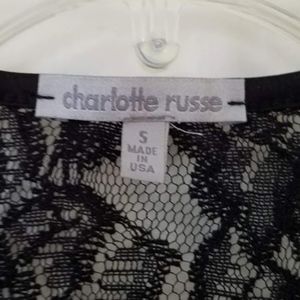 Black lace crop top from Charloette Russe. Back is kind of see through, the front is protected by half an undershirt attachment. Only worn once. Beaded accents around the neckline.