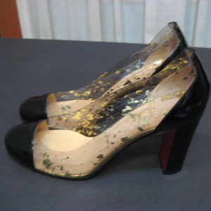 Black patent leather Christian Louboutin Un Bout Round cap-toe pumps with PVC panels at sides featuring gold flecks, tonal stitching and covered heels.