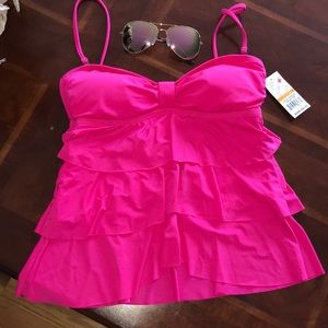 This is brand new with tags size small, beautiful hot pink color. Ruffled in the front around back, straps are removable! Lightly padded