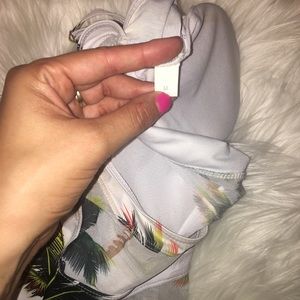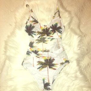 White palm tree one piece swimsuit, has some sheer pieces around the stomach! Bought online but didn’t fit!
