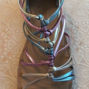 Gladiator silhouette with knotted straps and metallic shimmer with an open toe & Back zipper entry, smooth lining with comfort footbed and Durable traction outsole.