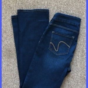 4 pockets Mid rise fit Barely Bootcut 32” inseam.