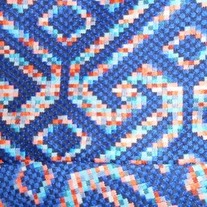 Excellent condition! Looks New! Eva Franco pencil skirt. 100% polyester, bright blue with knitted jacquard colorful design on front (see last photo for close up of texture!) Solid blue back with slit. Lined with invisible back zipper. Perfect for summer. Skirt does have some stretch. Appx. measurements are noted below taken laying flat: