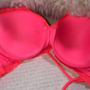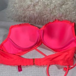 Victoria’s Secret bikini top in fluorescent orange with ruffle bottom and tie top. Lightly padded. 34A.