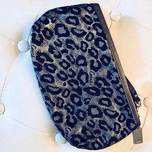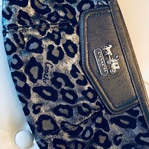 Silver & gray canvas Coach wristlet with light purple lining, complete with an interior flat pocket.