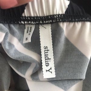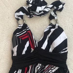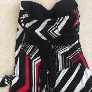 Beautiful black, red, and white floor length dress. I am 5’1” and even with heels I almost trip on the hem. Halter dress with empire waist and tie belt. Waist is elastic.