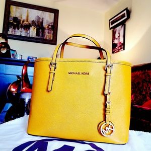This is a medium mustard colored tote for those of you who find the large jetset too big, here you go. 14.5L X 9H X 5.5W. Excellent condition 😉