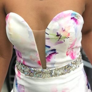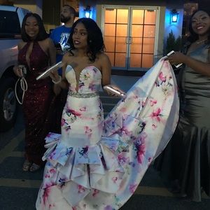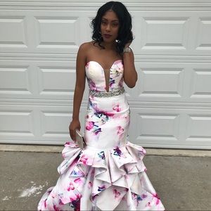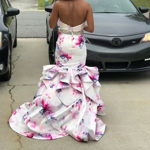 Beautiful Rachel Allen mermaid dress. Bright floral print with a gorgeous rhinestone beaded waist and about a 2 foot train. The dress was originally a size 6, but it has been altered to a size 2.