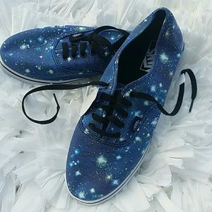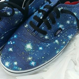 Awesome lo profile Vans with Galaxy, Cosmos, Stars, Planets, Cloud Crush, Universe Venus, Jupiter, Orion, Mars print in blue canvas with a purple hue in some areas, marbeling print (crackle effect)....and black laces, brand new with tags - 2x available - stock up or share some star dust with your friends! :)