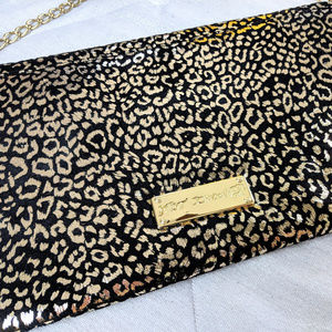 Beautiful Envelope Clutch by BETSEY JOHNSON, cheetah gold and black metallic with removable gold metal chain shoulder strap and gold studs detail. This is a large size, flap closure, no interior pockets.