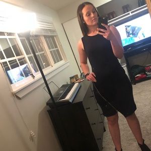 Navy blue dress with black accents. Black diagonal line from left waist to right hip. Zipper from right hip to bottom of dress.