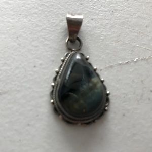 .925 silver pendant with beautiful Labradorite stone. Depending on the light it appears dark blue, greenish blue or gray. Approximately 1”. Purchased on a trip in the Caribbean. Nonsmoking, pet-friendly home.
