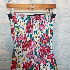 Vintage 80s semi-formal / prom / homecoming / cocktail dress Excellent condition . Ruched bodice with black flower embellishment at waist, and black banded trim. Smocked back with zip. 34" bust with some room due to smocking 28" waist 40" length Fun fact: The same dress was seen in an episode of the 80s hit TV show "Night Court."