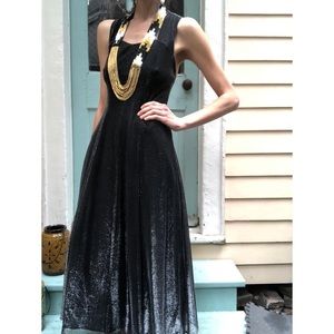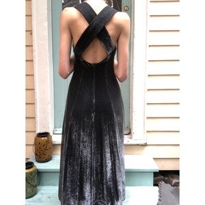 Vintage silver shimmery gown. Photos don’t do this justice! No size but fits medium best. Zips up back.
